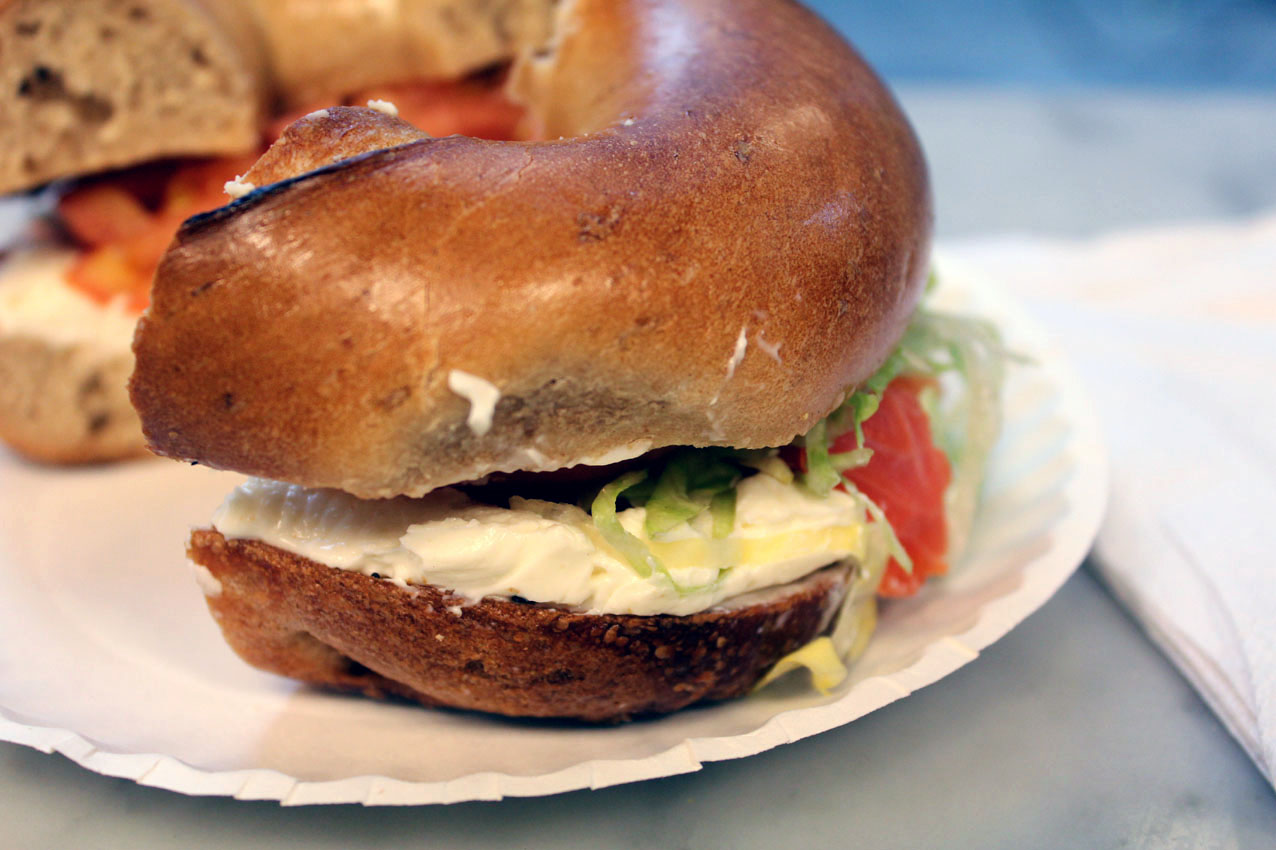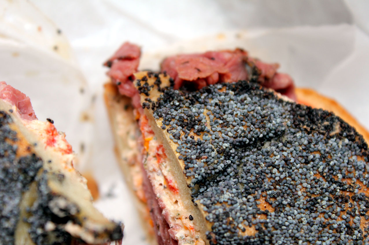 Au début, on est un peu intimidés par la jungle de «schmears» à choix. Les fromages à tartiner se déclinent en un assortiment ubuesque d’arômes. Aux noix et raisins secs, olives, cébettes, aux herbes, au cheddar, aux jalapeños, puis il y a leurs correspondances au tofu. Et le gouffre de l’indécision ne se referme pas ici. Car on peut ensuite varier les plaisirs en fourrant la mie, par pellées, de salade de thon, de crevettes, de hareng, d’esturgeon lacustre, d’œufs, d’aubergines à l’espagnole, de houmous, de salami kosher ou de Gênes, de poulet cajun ou teriyaki, de roastbeef, de dinde lustrée au miel, de jambon campagnard. Entre autres. Ou de pastrami, dont les replis lascifs sont presque sexuels et contre lesquels s’accolent les grains bleutés du pavot.