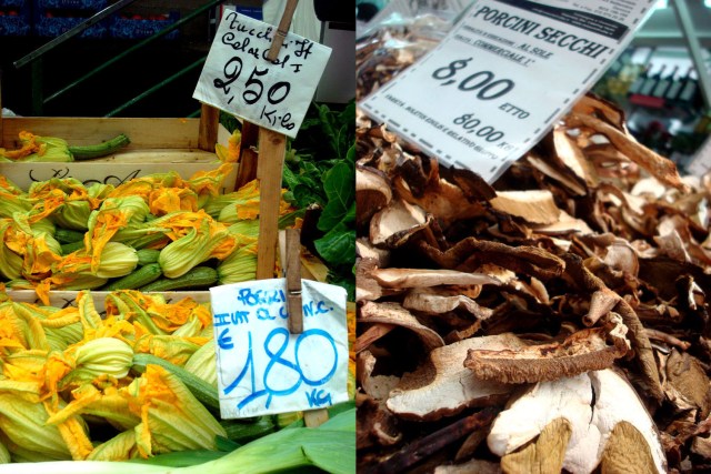 Je n’ai pas leur efficacité et me pavane devant l’étalage, ça m’angoisse presque de penser que je ne pourrai jamais vivre assez longtemps pour tout goûter. Je suis devant l’autel : des aubergines grillées puis marinées, des poivrons farcis, des tartes aux légumes verts, des rouleaux de mozzarella et saumon fumé, du pecorino ligure et d’autres chèvres dans des manteaux d’herbe, des tresses de mozzarella des Pouilles à en faire pâlir de jalousie Italo Calvino, des burrate empaquetées dans des feuilles et conservées dans une sorte d’eau laiteuse, des petites tommes qu’ils servent parfois grillées, avec ou sans lard, du stracchino affaissé et des caciocavalli éventrés, du provolone et du Grana Padano extra. Plus loin, se chevauchent de la bresaola, des cuisses de cochon et du salami que le vendeur au chapeau blanc fourre dans un petit pain frais à la demande, des mortadelle qui vous font des tranches grosses comme des 33 tours, du lapin piémontais, du jambon cru à la croûte si noire qu’on le croirait cendré. Et sur les rayonnages en bois, on trouve aussi des pâtes d’amandes, des pandolci briochés qui rivalisent d’anis vert, des tartes à la confiture, les inconditionnelles trofie, des câpres, de la crème d’olives, du limoncello.