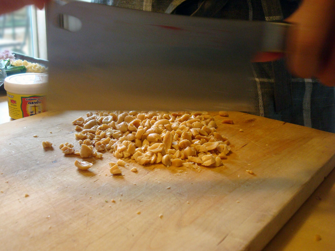 On prolonge les festivités quelques instants puis on adjoint les nouilles drainées et les cacahouètes réservées. Chris laisse les ingrédients interagir, il aime à croire qu’ils s’adonnent tous au Likay, la danse populaire thaïlandaise.