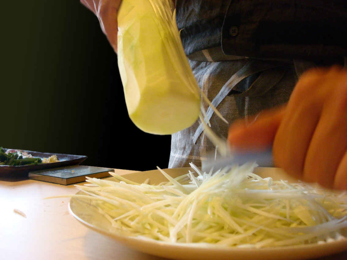 J’avais été chargée d’acheter l’outil magique, grêles ondes d’acier inox : la râpe à légumes thaï avec laquelle on lacère la papaye verte. Simplement récolté avant sa pleine maturité, le fruit ressemble presque à une corpulente courgette. Je me réjouis de lui savoir un goût fort différent de celui qu’il acquiert quand sa peau vire à l’orange. Sa chair est parfois utilisée pour guérir les plaies, je me demande au passage si elle peut aider celles du cœur aussi.