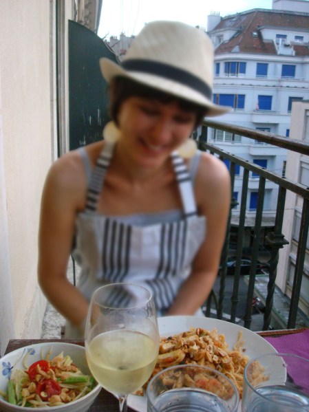 Je suis priée de couper quelques tomates cerises en deux et de longs haricots verts thaïlandais en tronçons de 1.2 inches. Puisque nous sommes à Genève, j’opte pour 3 centimètres et m’applique moyennant une minutie d’architecte.