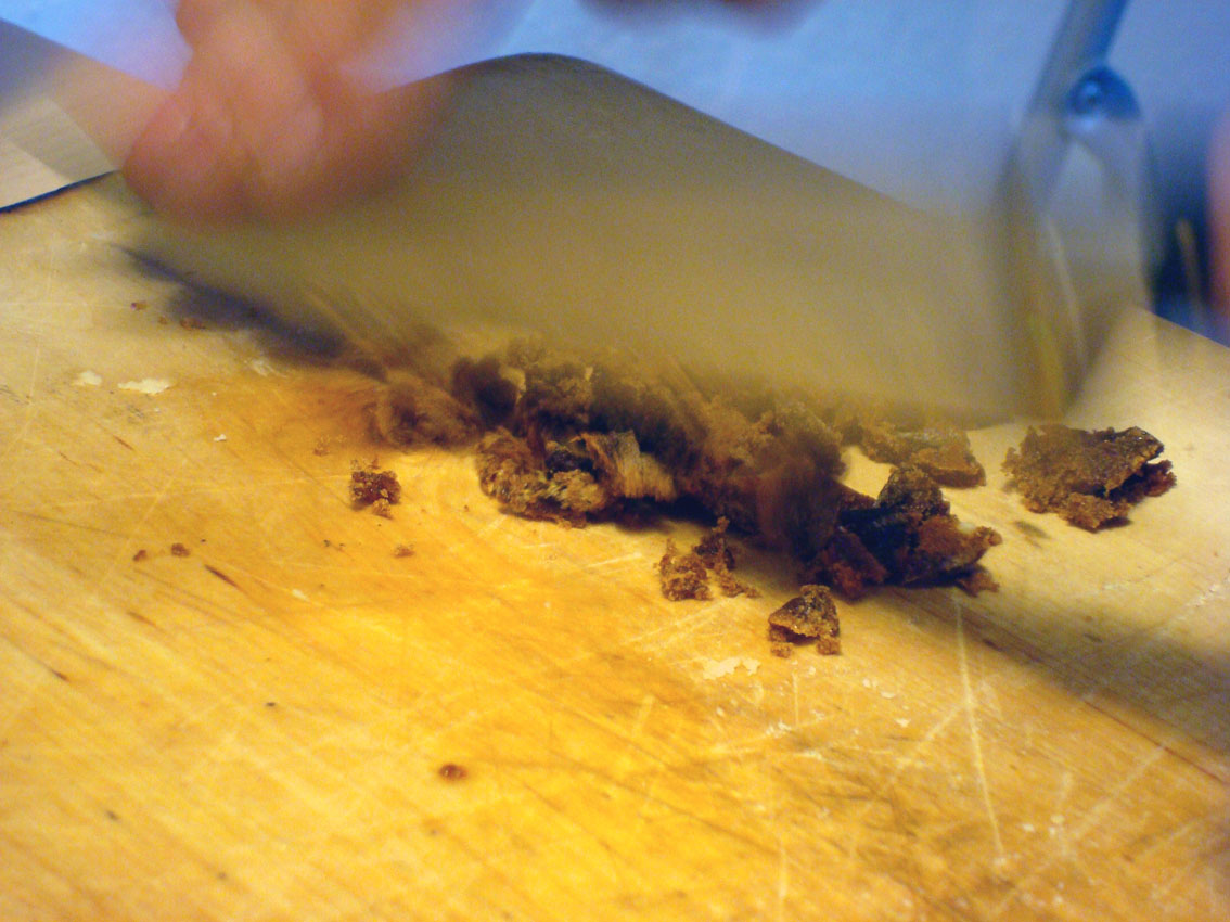 On fait rouler quatre cuillers à soupe de cacahouètes sur une planche en bois pour les broyer grossièrement. Mr Duckett veut que je les coupe en cinquièmes, je lui ris un peu au nez. On tente de juste les dorer, on s’égare, on les calcine, on recommence.