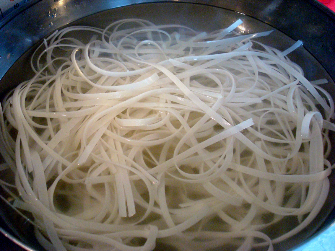 On commence par faire tremper 200 g de nouilles de riz fraîches dans de l’eau chaude jusqu’à ce qu’elles soient ramollies. Chris en entame une, la trouve encore trop coriace, remet l’autre moitié dans le bol en s’excusant. C’est ainsi qu’ils font dans les restaurants de Bangkok, on le pardonne.