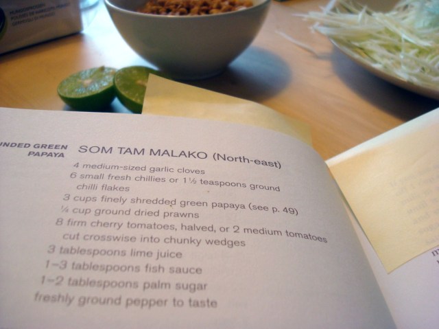 Un peu submergés par l’idée de préparer 3 plats puis peut-être maintes framboises désorientées, on élira 2 mets : un som tam malako, une salade de papaye verte selon une recette du Nord-Est de la Thaïlande, et le célèbre pad thaï.