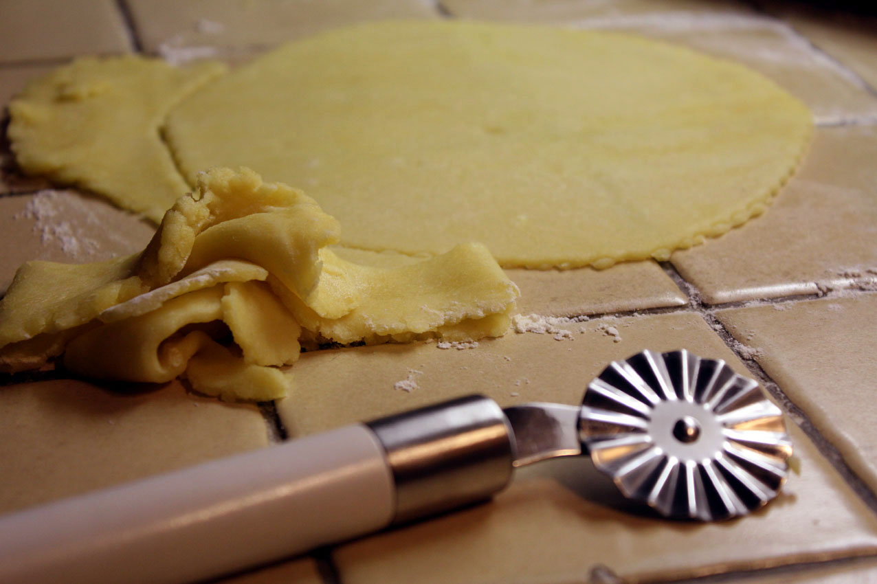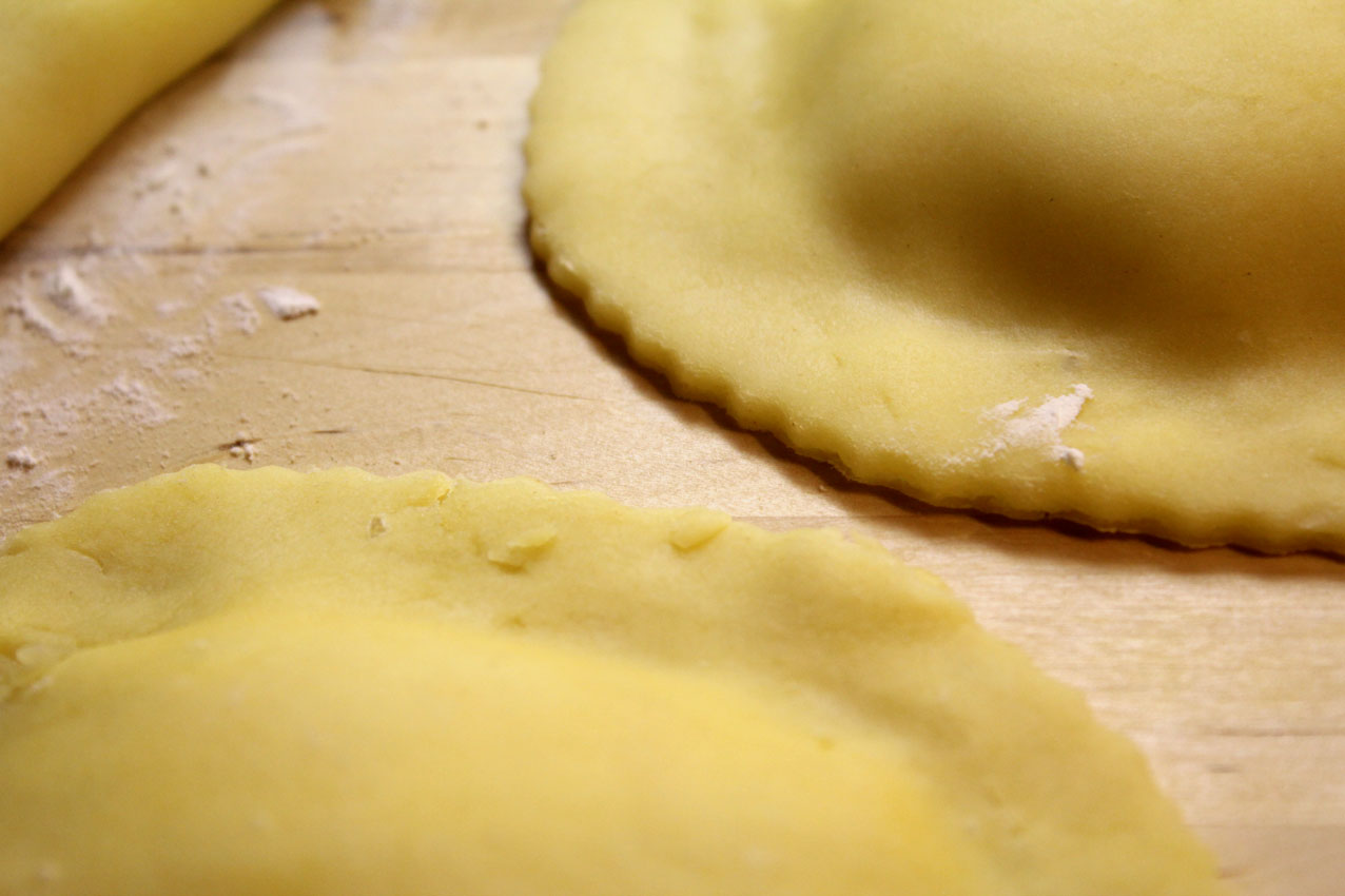 Les six cercles ont tous une taille différente, ils sont en réalité très loin d’être parfaits néanmoins c’est comme ça qu’on les aime. L’irrégularité donne une idée de «cucina casalingha» véritable. Et l’heure n’est point à la constance. On distribue la farce et on fait s’étreindre les ronds de pâte en scellant bien leurs bords.