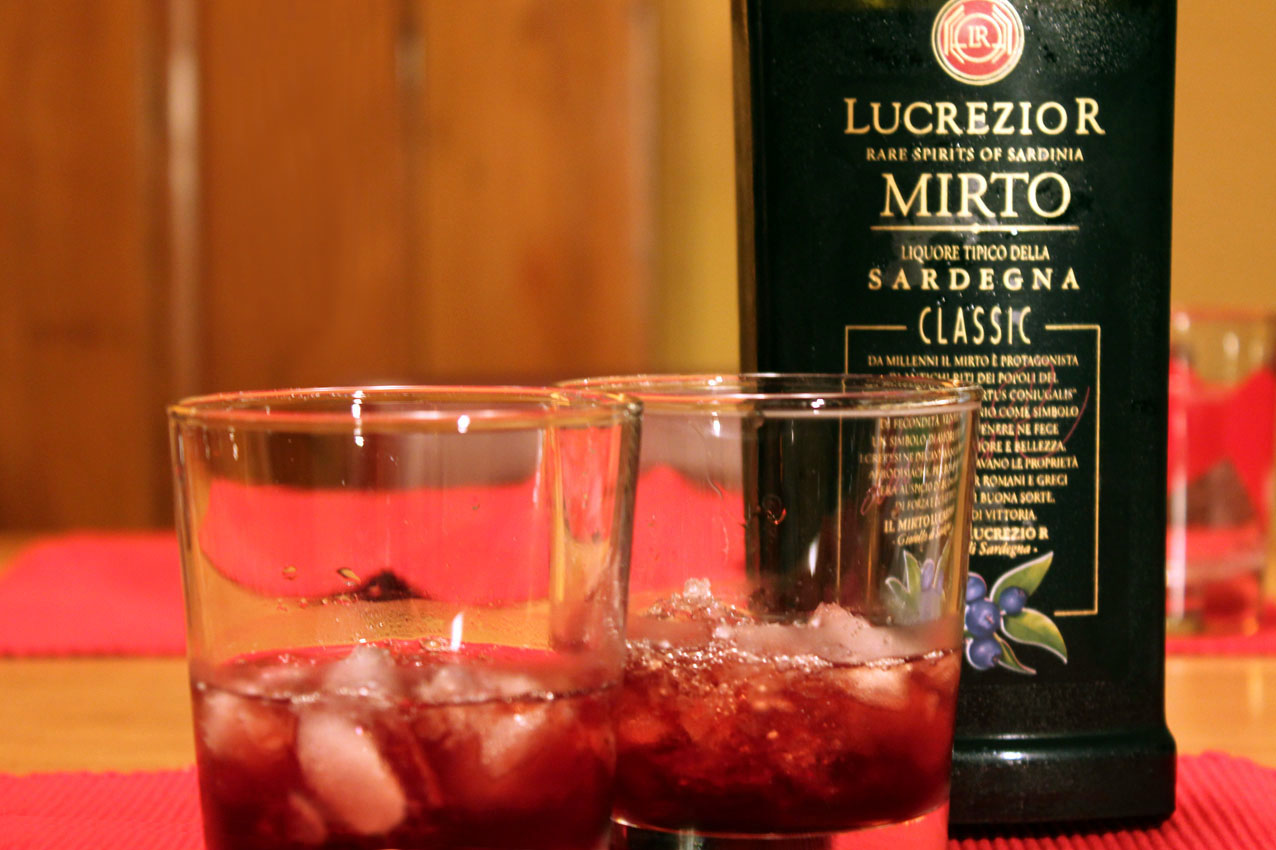 L’ataraxie est atteinte par la suite sur un lit de glace pilée. Directement importée de là-bas, une bouteille de «mirto» recèle une liqueur intense derrière le verre de jais. Les baies sauvages du myrte sont un mythe et leurs anthocyanes nous pigmentent la moelle.