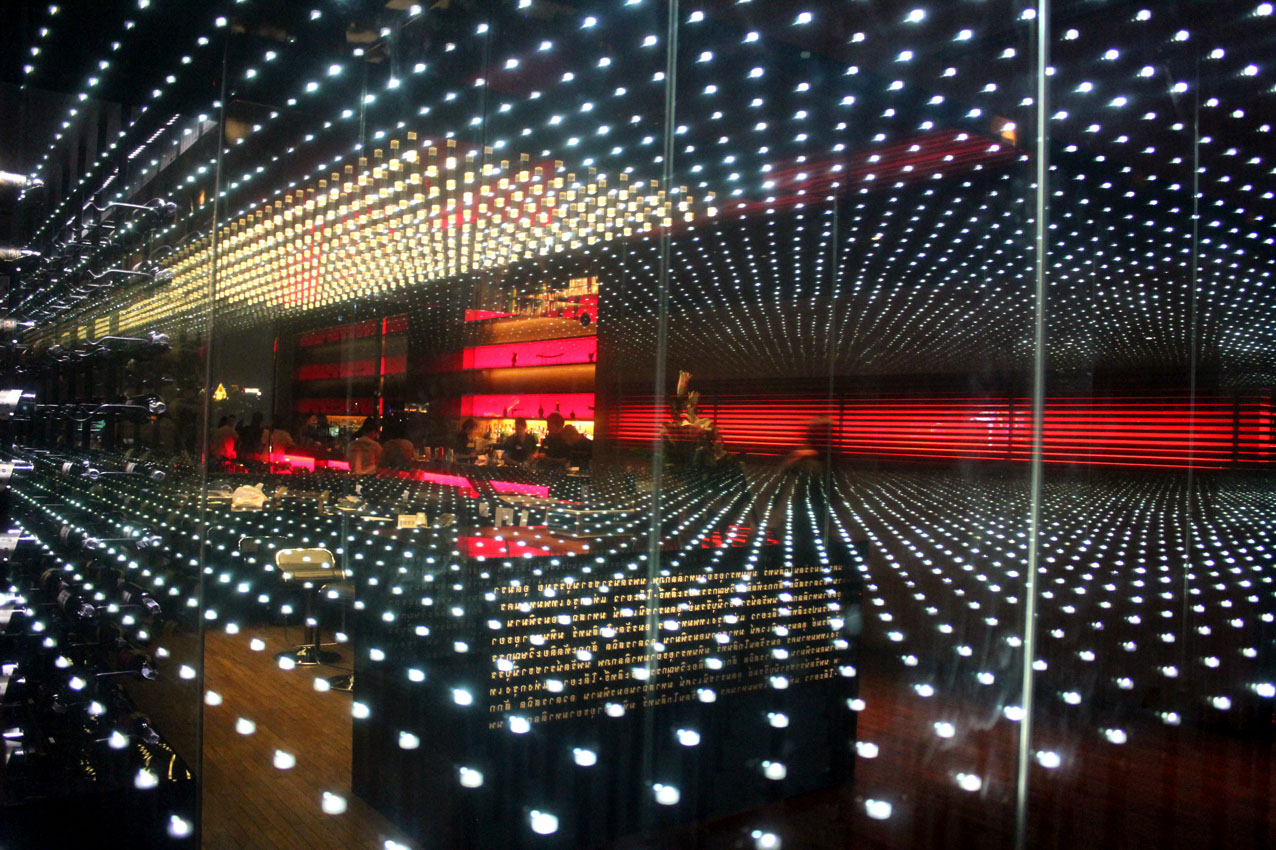 Au 25ème étage de la Column Tower, le Long Table Restaurant fait glisser acid jazz, catwalk beats ou soulful house sur les coussins en coton crème des alcôves. Vos escarpins sont rangés dans des tiroirs escamotables, on vous prête de délicates pantoufles virginales. Un massage des cervicales est proposé à des cadets branchés, des salaces turpides et en surpoids, des cravates bigarrées trempent dans la sauce d’huître. Puis des escortes en talons, ces hétaïres éthérées, font semblant de rire et filent trop souvent aux toilettes. Entre les diodes électroluminescentes tailladées comme une frange, je note que les bouteilles de vin sont stockées horizontalement. Indéniable bon point. De la terrasse, les regards fardés effleurent l’eau rasante de la piscine avant de chuter dans le vide. La ville bat tout en bas, luciole dans la nuit, fabuleuse, insondable.