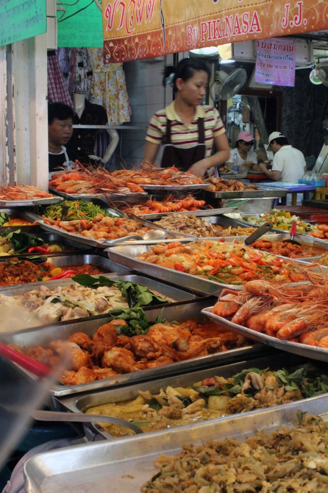 Chatuchak est une expérience de vie. Situé au nord du centre-ville, ce marché est un des plus étendus au monde. Sur plus de 100’000m2, il compte environ 15’000 échoppes. On y déniche livres, décorations et ornements, peintures ou gravures, des miniatures et des reproductions en miniature de miniatures, des plantes, des housses de coussins, des sacs à pompons, des bijoux, des poteries, des tissus et des papiers fascinants aux incrustations précieuses, des rubans, des vasques de salle de bain qu’il serait pratique de ramener en Suisse, des vêtements, des vraies Converse ou des fausses lunettes Chanel, des antiquités, du mobilier et des animaux domestiques. Entre autres.