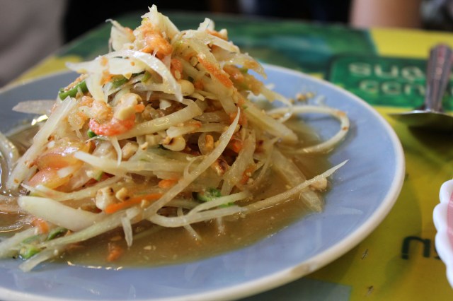 Par-delà un énorme mont de légumes en lambeaux, on aperçoit la dextre du cuisinier maculer de sauce un bouton de stéréo pour pousser au maximum des tangos électroniques déracinés. On se partage une salade de «glass noodles», nouilles fabriquées à base de farine de haricots mungo, serpentins siliconés sous un hachis de porc et relevé de menthe et de coriandre fraîches ainsi que les crevettes séchées, fluettes virgules surettes, d’une «som tam malako». Un menu bonhomme passe entre les tables avec un plateau garni de portions de poulet grillé et d’ardents sachets de riz glutineux, on se laisse tenter. Il distribue aussi une sélection de boissons et cherche à nous convaincre que nous aurions de toute façon choisi la limonade qu’il nous tend avant de lancer des verres envahis de glaçons sur la toile cirée.