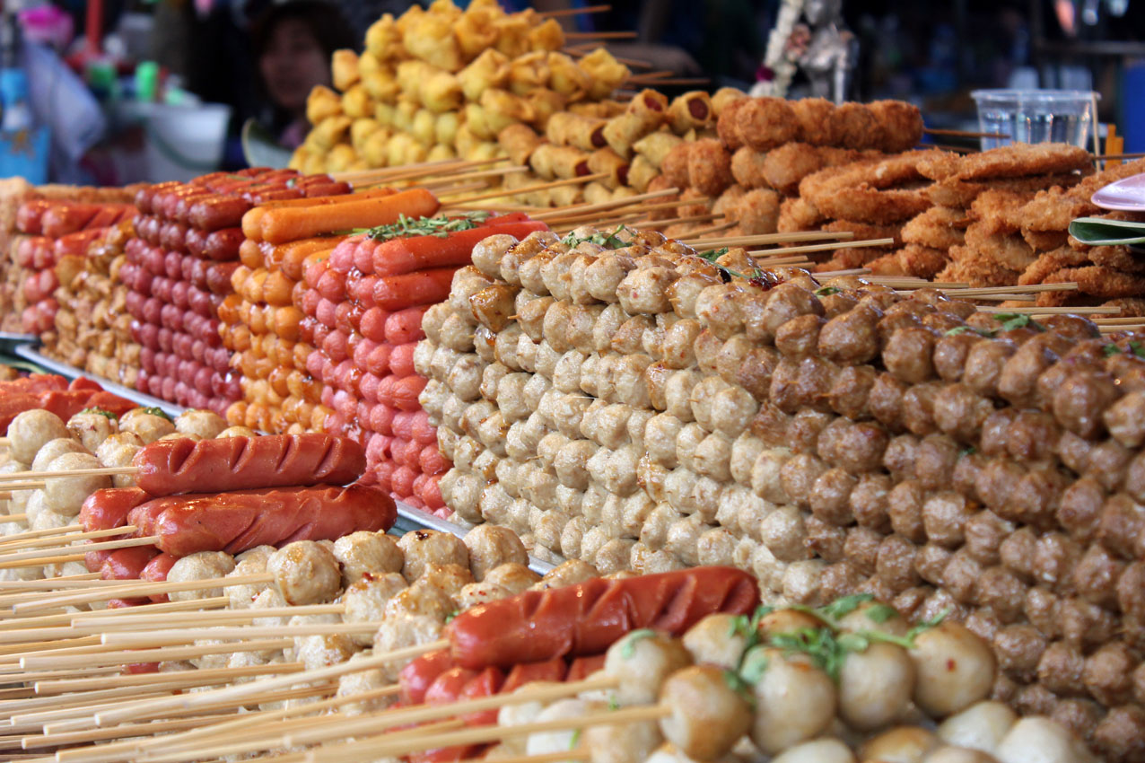 Buvettes et cantines ponctuent le tout. Dynamisés par une quantité déraisonnée de nectar de tangérines, nous sommes restés quatre longues heures à louvoyer dans cet éparpillement insaisissable. Et mes globes écarquillés de choir sur un lot de crabes bleutés et ficelés, sur la langueur de crustacés aux péréiopodes entremêlés, des cupcakes pondéreux à l’américaine comme les thaïlandais affectionnent tant, des saucisses empalées, sur des œufs de calamar, sur d’indescriptibles bouillies à grains sombres dont la vendeuse entreprend en vain de nous expliquer la composition. La seule certitude veut que ce ne soient pas des kiwis, cependant le mystère demeure entier.