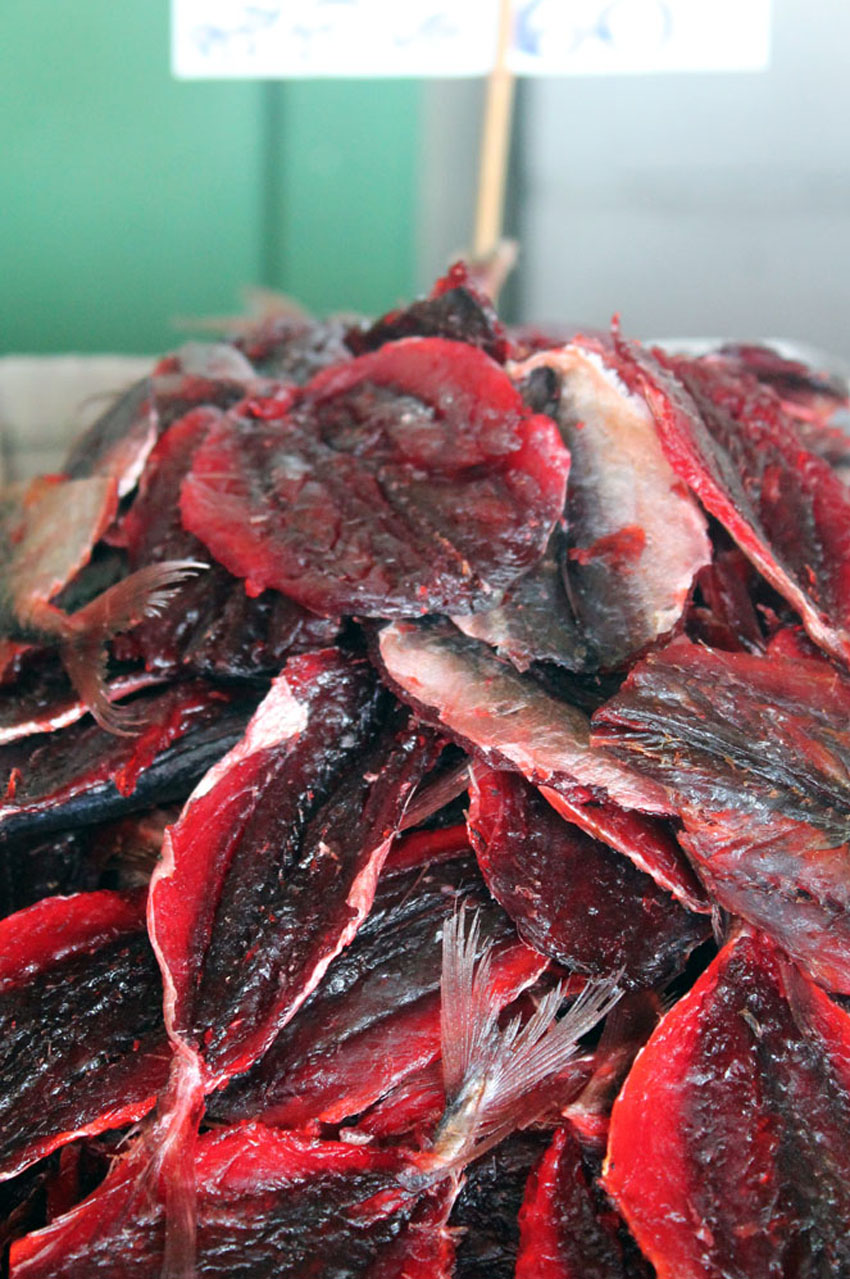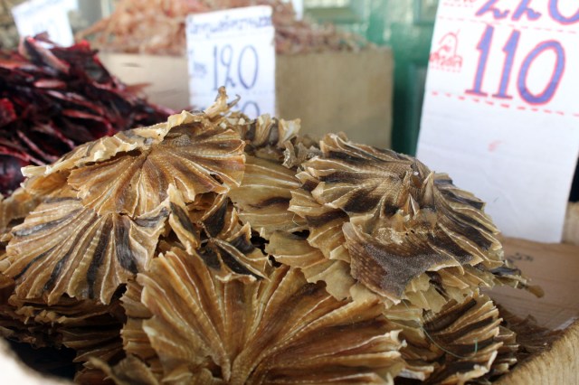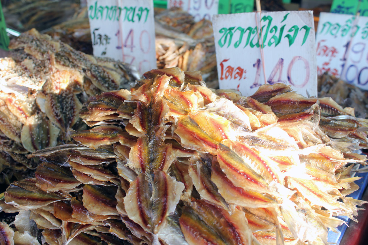Nous descendons à la hauteur du Grand Palais et traversons un marché de poissons séchés. Sont empilés sur du papier journal, dans des caissettes en plastique, des filets au dos épineux, pourpres ou striés de jaune, aux ourlets diaphanes et cassants, des espèces d’étoiles rugueuses, cannelées, dont seules deux minuscules orbites rapprochent du règne animal ainsi que des sèches entières, scellées les unes aux autres par la déshydratation et que l’on semble pouvoir rompre selon le pointillé à l’instar de ces pièces de modélisme en kits.