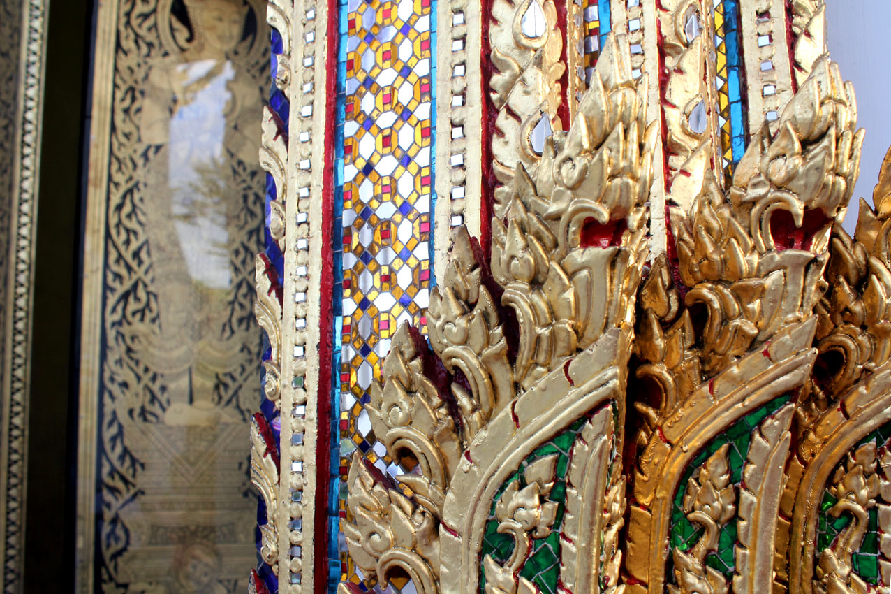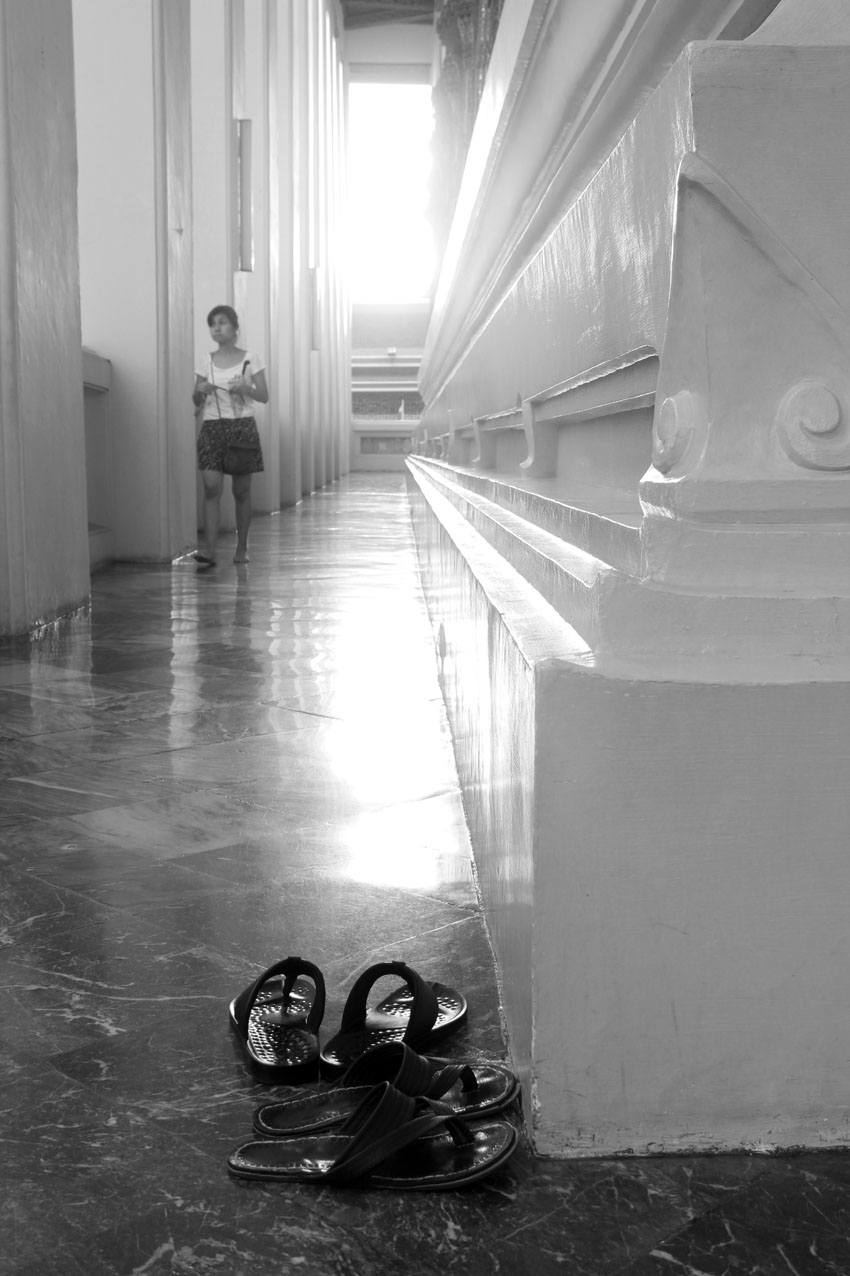 Une cérémonie est en cours, nous patientons dehors, les pieds nus sur le marbre chaud. Les feuilles d’or volètent, se fragmentent en une poussière divine puis l’on en retrouve des grains collés sous nos orteils. Et des moustaches de pierre nous saluent à la nuit tombante.