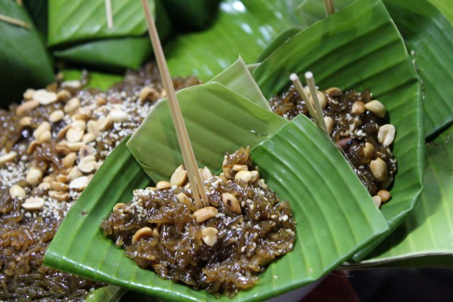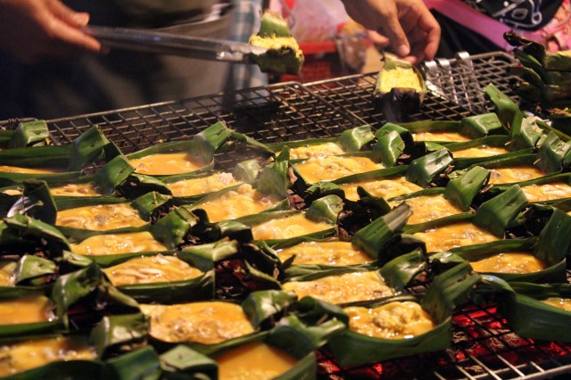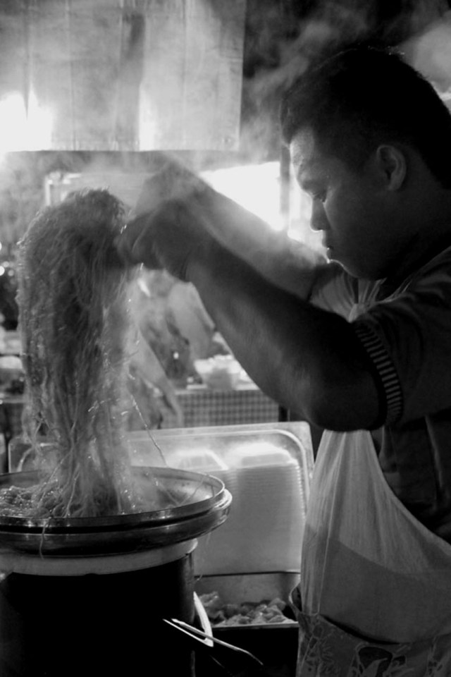 Les ampoules électriques ébauchent des ombres sur divers fagots énigmatiques, des œufs de caille frits, des confections visqueuses, des poulets -écartelés par le milieu et affaissés sans colonne ni espoir, avec les ailes repliées- puis enduits de miel ou bouillis en sauce de poisson, du riz collant à la mangue, des boulettes de viande aux algues, des nectars de fleurs d’hibiscus, de longan dans des amphores en céramique, des fragments de porc séché empilés comme un tas de feuilles mortes rendues brillantes par la pluie, une corpulente meule de gelée noire aux herbes chinoises qu’une jeune femme au style asymétrique parcelle à la demande et saupoudre de sucre brut.