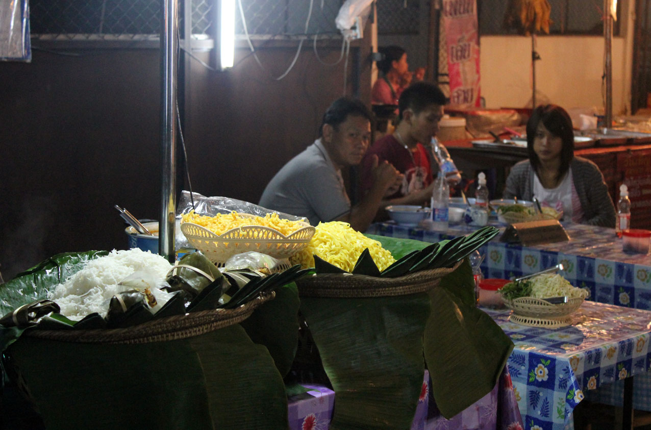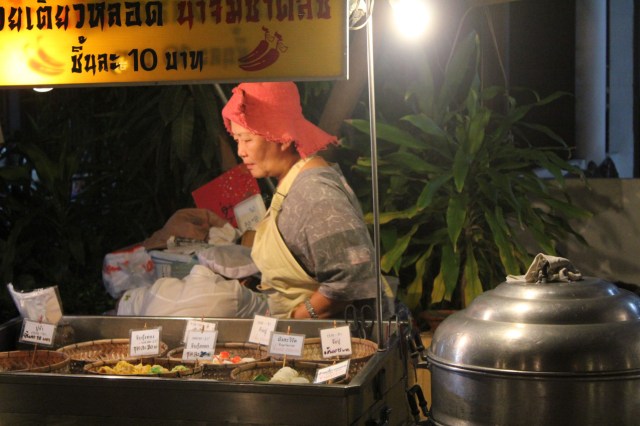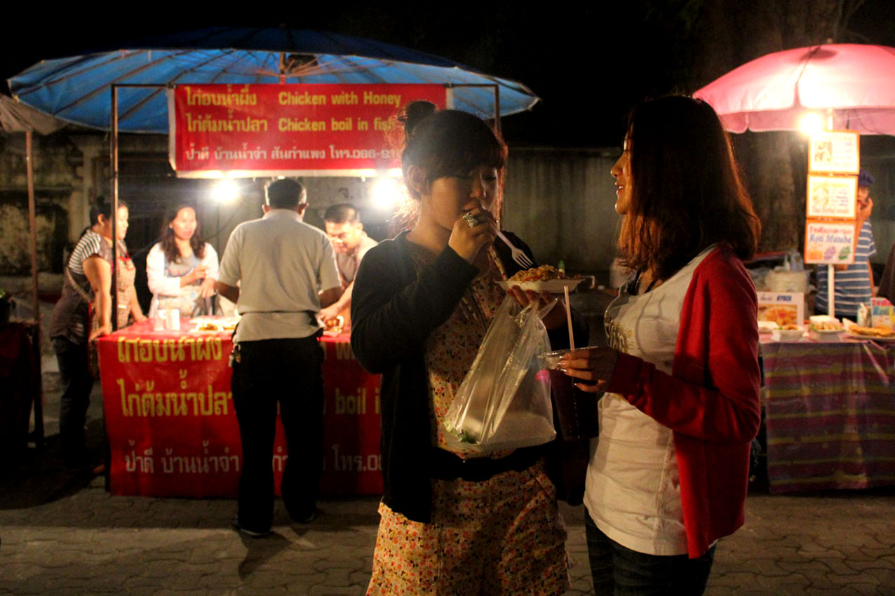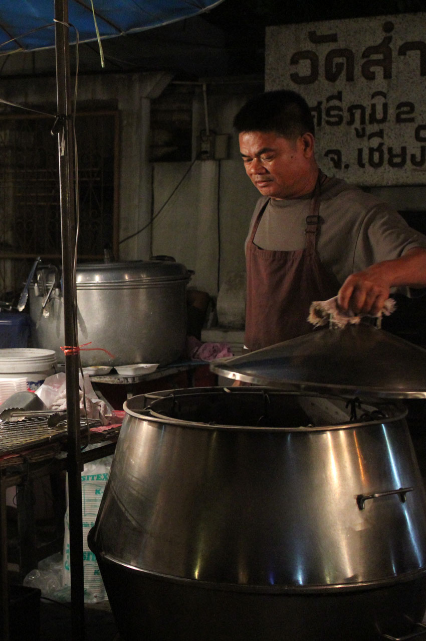 De 16 heures à minuit tous les dimanches, l’incandescence brûle l’asphalte, part de Th Ratchadamnoen et enflamme le quartier, embrase les monuments religieux. Au moins sept temples contribuent à la foire, des étals de nourriture se répandent aux pieds de Buddha. Ceux qui ont soudain l’idée saugrenue de se recueillir ont de la peine à se concentrer. Un moine ânonne dans un micro. Devant lui sont attablés cinq pratiquants qui l’écoutent, ils vendent des offrandes sous des rubans lilas festonnés d’or. Toute la communauté monastique sangha semble vouloir se repaître de beignets en panure.