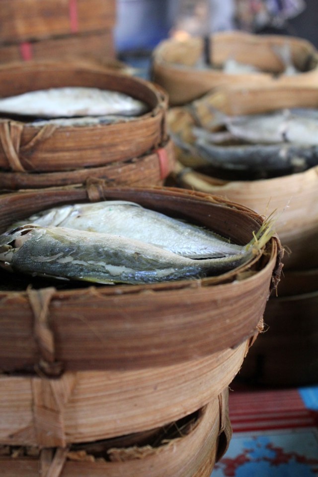 Ho, cuisinier rongé quoique fabuleux, nous emmène d’abord visiter le marché Talat Ton Phayon où il nous conte les racines, ces tiges de bambou qui mijotent dans une bassine circulaire et que l’on pèle avant de consommer telles quelles ou d’émincer pour un sauté, les aubergines, agates virginales, humectées, bombées et idéales, les vers en barquettes, les têtes de coq rôties entières avec les yeux et au fond de hauts seaux ouverts: du lait de coco récemment pressé dans lequel notre guide gastronomique crée d’enthousiastes remous moyennant un long bâton de bois.