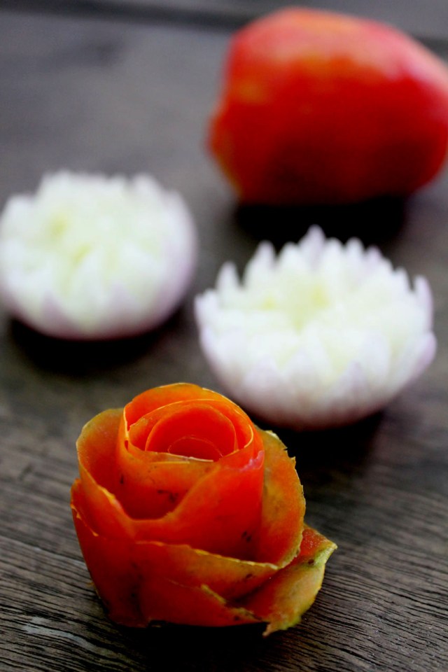 Nous avons maculé nos tabliers, aimé les noix de cajou plus que de raison, nous avons teinté d’accents du Yorkshire, écossais et flamands nos soufflés de vivaneau. Nous avons déployé des efforts honorables pour décimer les nombreuses concoctions puis pour faire naître une rose d’une peau de tomate. Un nymphéa d’un oignon.