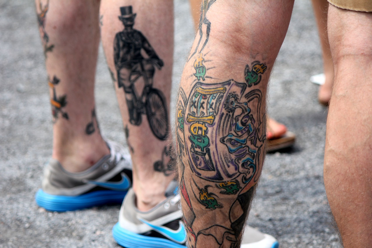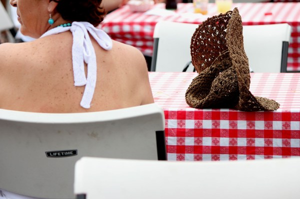 Sur les tables, des nappes carrelées. Sous les panamas en pied-de-poule, des crins mauves, sous de grosses lunettes, les pupilles comblées d’un dimanche après-midi et sous les tatouages, le tégument blême.