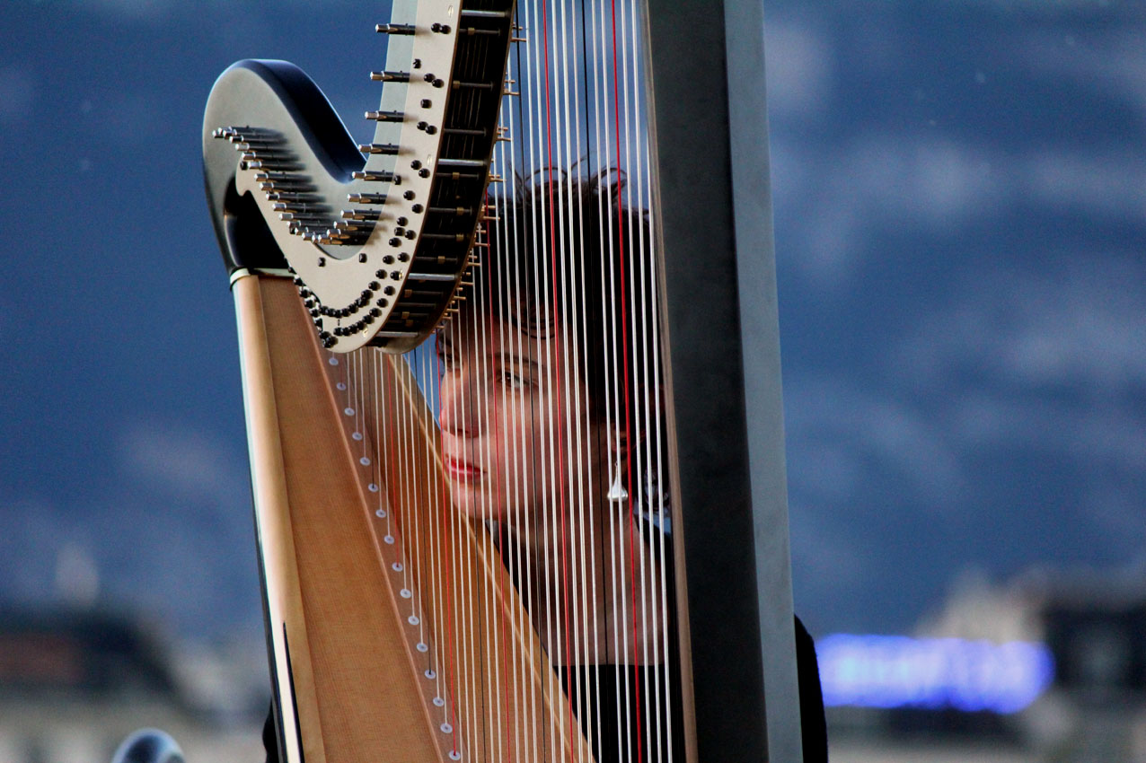 Dans l’air mauve se dressent les micros comme d’élancés échassiers et au sol, des fils s’entortillent. Vipères électriques parmi les mégots, d’éparses plumes et une profusion de tasses au marc prometteur. Un bouquet de veines saille sur les muscles crayeux d’un clarinettiste. Mes pensées lézardent entre les cordes d’une harpe, plus rien ne compte. Une pincette protège les octaves de la brise et les fanions du phare s’agitent en un ballet presque tibétain.