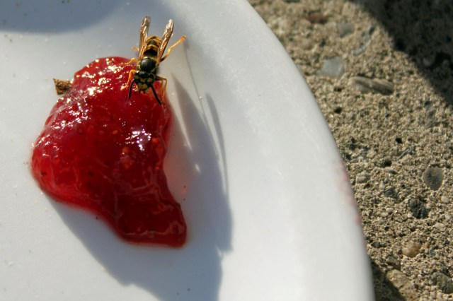 Il se peut qu’il n’y ait pas de miel à cause des guêpes mais ces dernières ne sont pas folles et s’enlisent les pattes dans la confiture, grenat à petits grains que l’on nous étale sur deux énormes tranches de pain Paillasse.