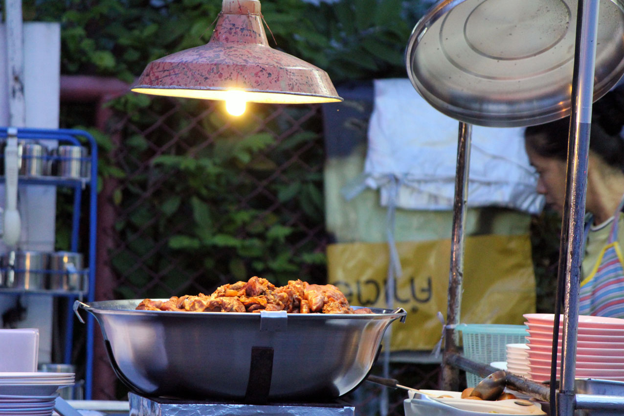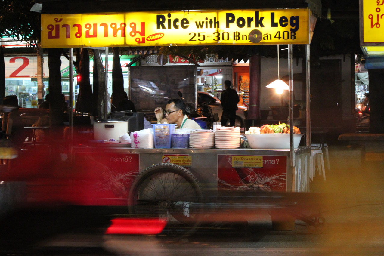 Au Talat Pratu Chiang Mai, on peut choisir sa brochette de calamars avant de la tendre à de frêles dames qui les crament à la minute puis les fourrent dans un sachet où elles croient toujours bon de balancer un déluge de condiments létaux. Le céphalopode est parfois caoutchouteux et finit généralement dans la rivière. Une option se manifeste alors entre six croupions de poulet, le vendeur n’hésite pas à nous présenter son propre postérieur afin de nous expliquer la localisation des pièces. Les morceaux, bardés d’une couche prépondérante de gras, ne sont qu’entamés. Et avec parcimonie.