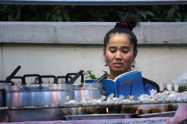 J’absorbe la bande sonore de ce scénario exquis, il y a les cliquetis de la louche qui gratte le métal du wok car ici, cancer et téflon sont des oxymores. Mais aussi le grésillement des ingrédients, la goutte d’eau qui quitte une ciboulette et s’évapore en geignant. Le moteur des voitures, des scooters, des tuktuks, des oxydes d’azote sur les jambes de cochon, les savates qui raclent le bitume. Deux enfants jouent à proximité, le garçon a la face dans un sac en plastique or personne ne semble sourciller.